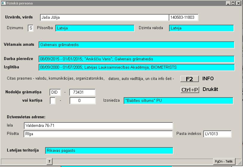 Amatu maiņas izvēlnē pirmo reizi aizpildot attēlā redzamo kartiņu, tiek veidots dokuments – darba līgums. Darba līguma izdrukāšanas laikā, dokumentam tiek piešķirts unikālais numurs. Ir jāpiemetina, ka saskaņa ar likumu “Dokumentu izstrādāšanas un noformēšanas kārtība” unikālais numurs tiek piešķirts visā Programmas darbības laikā, nemainot kārtību sākoties jaunam gadam.