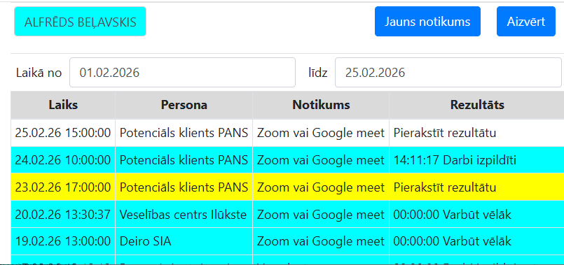 Attēlā augstāk ir redzami visi notikumi kuri bijuši un ar dzeltenu iekrāsoti tie kuri nav izpildīti.