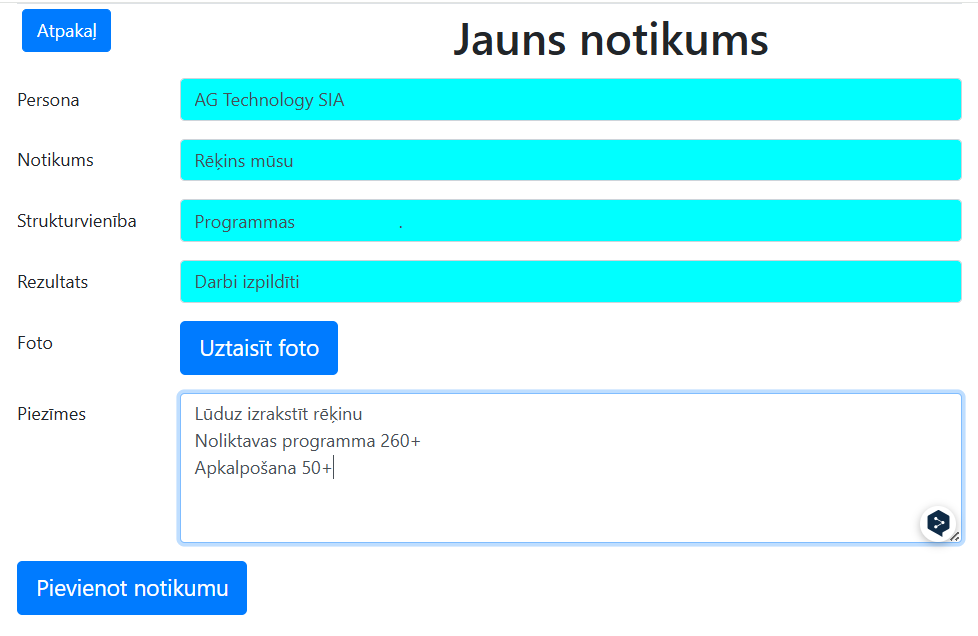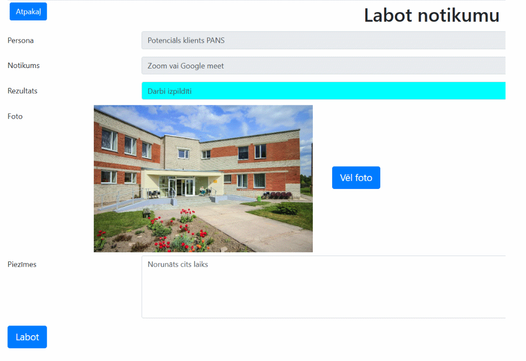 Attēlā ir redzams, ka notikumam ir rezultāts -rēķins izrakstīts. Pie notikuma var pievienot neierobežota lieluma piezīmi speciālā laukā. Tomēr lielākus tekstus, arī grafisku un mediju failus pie notikuma labāk “Piestiprināt” ar taustiņa “Pielikt” palīdzību.