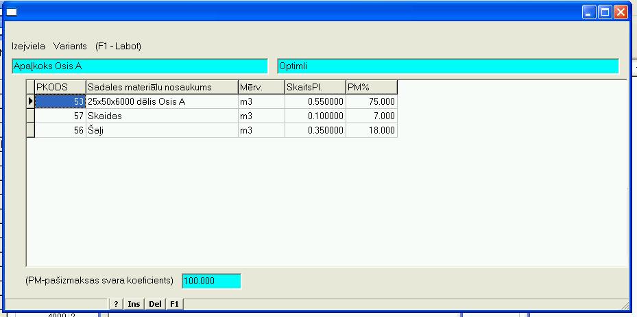 Turklāt ar taustiņa (pogas) F1 palīdzību var arī izmainīt izmantoto Apaļkoks Osis A daudzumu, nemainot pašizmaksas sadalījuma smaguma koeficientus.
