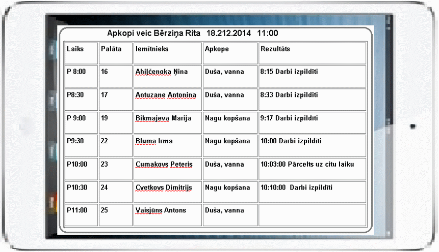 Lai samazinātu uzskaites darbu, žurnālus un citus papīra ierakstus, apkopes darbiniekiem tiek izstrādāts Programmas variants, kas strādā uz planšetes. Planšetes programma, kā tas bija minēts iepriekš, strādā WiFi, un apkopi veicošs Uzņēmuma darbinieks informāciju par paveikto jāvar ērtā veidā var ievadīt tieši palātā, kur notiek iemītnieku apkope. Palaižot programmu, tiek prasītas piekļuves parole. Pirms tam stacionārajā datorā katram darbiniekam tiek šī parole piešķirta, Ir ļoti svarīgi, lai parole paliktu konfidenciāla. Tas tādēļ, lai nenotiktu ļaunprātīga Programmas izmantošana un informācijas ievadīšana ar citu vārdu. Ievadot savu paroli, Programmas operatoram ir jārāda tikai viņam plānotie apkopes darbi, sakārtoti laikā. Tas ir redzams zemāk parādītajā attēlā: